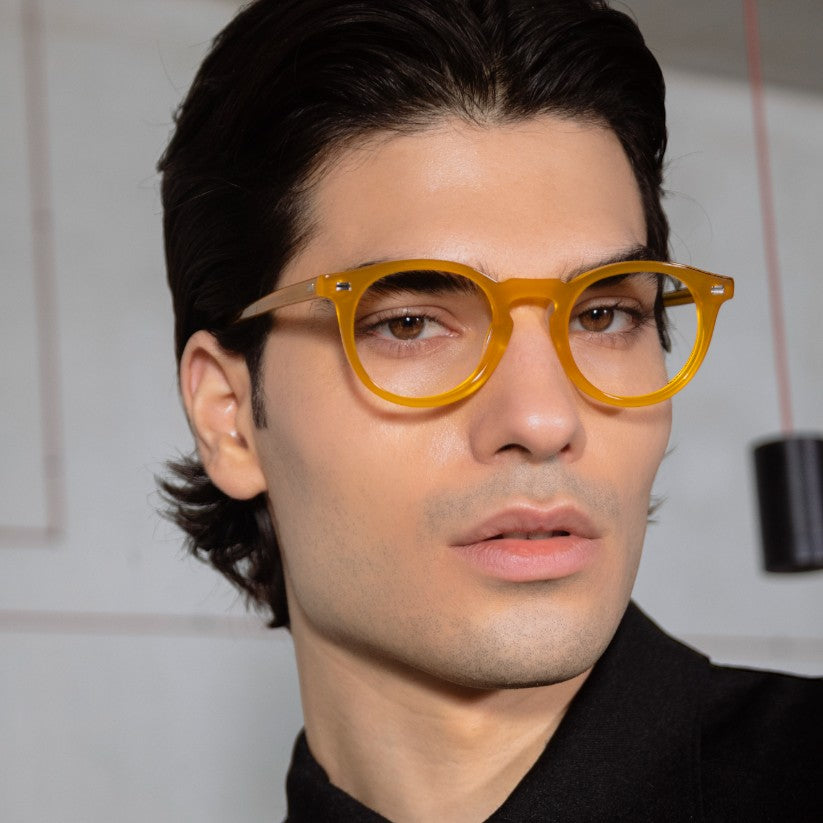 Brillen aus pantographiertem Zelluloseacetat, einem Material, das sich fest anfühlt und gleichzeitig eine raffinierte visuelle Präsentation bietet. Der Rahmen der Brille besteht aus Zelluloseacetatplatten, die im Laufe der Zeit gealtert und getrommelt wurden, um ihnen Glanz und Glanz zu verleihen.
